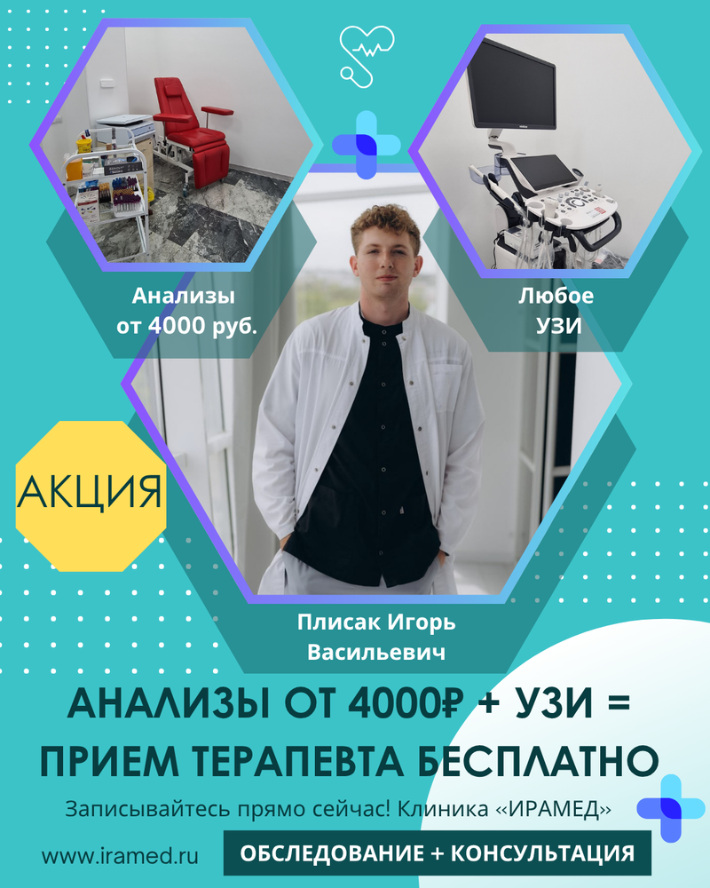 Как получить подарок: Сдайте анализы на сумму от 4000₽ + любое УЗИ = Прием врача-терапевта Плисака Игоря Васильевича В ПОДАРОК! 🎁